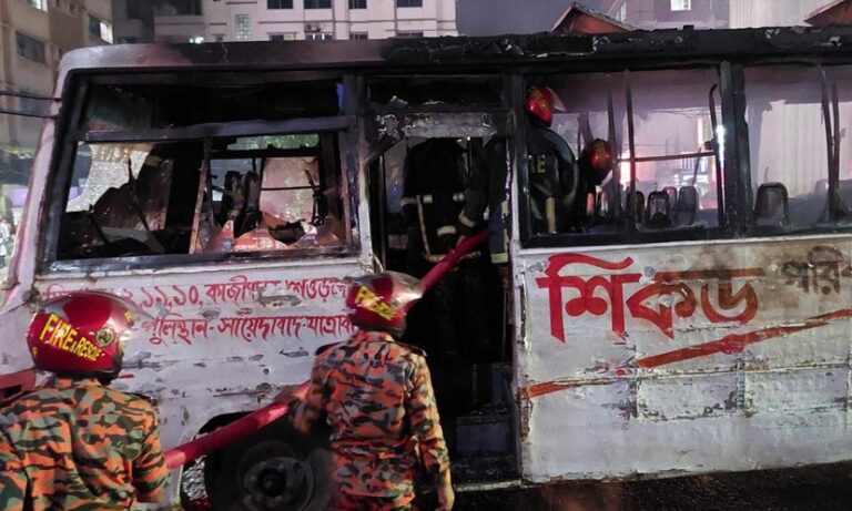 বিএনপি-জামায়াতের ডাকা অবরোধের মধ্যে রাজধানীর বাংলামোটরে যাত্রীবাহী একটি বাসে আগুন দিয়েছে দুর্বৃত্তরা। রবিবার (৫ নভেম্বর) সন্ধ্যা ৬টা ২২ মিনিটে আগুনের খবর পায় ফায়ার সার্ভিস। ফায়ার সার্ভিস ও সিভিল ডিফেন্স অধিদপ্তরের ডিউটি অফিসার এরশাদ হোসেন এ তথ্য নিশ্চিত করেছেন। তবে এতে হতাহতের কোনো সংবাদ পাওয়া যায়নি বলে জানিয়েছে ফায়ার সার্ভিস। তিনি জানান, বাংলামোটর…